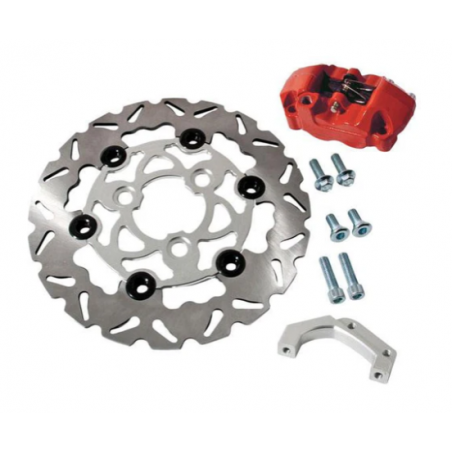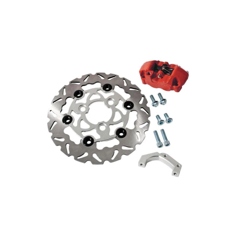 Un kit pour un freinage puissant composé d'un étrier de frein rouge 4 pistons opposés à fixation radiale, la patte de déport pour fixer l'étrier, un disque flottant de 200mm de diamètre.